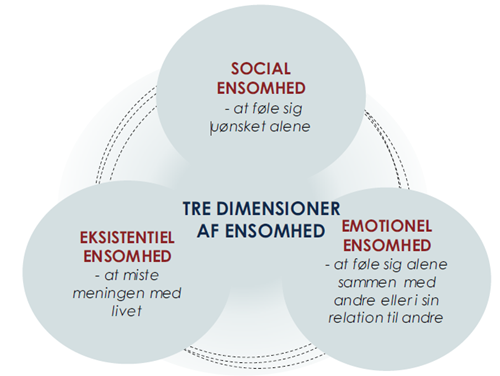 Ensomhedsfølelsen er en kompleks størrelse, som opleves forskelligt blandt mennesker. Man skelner ofte mellem tre dimensioner af ensomhed; social ensomhed, emotionel ensomhed og eksistentiel ensomhed, som er illustreret i nedenstående figur. De tre former for ensomhed kan opleves enten en ad gangen eller flere på én gang.